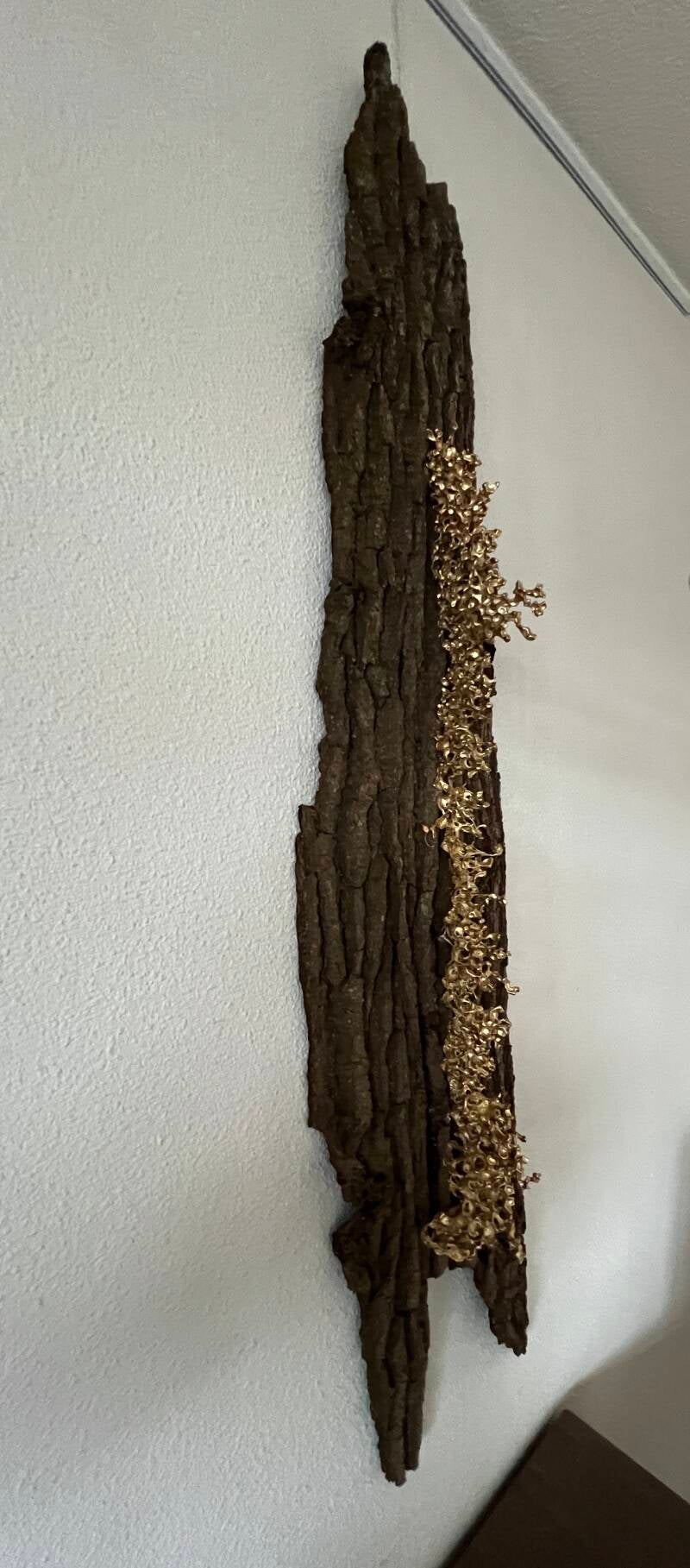 Radicaal gegoten aluminium brons op een prachtig stuk eiken-bast