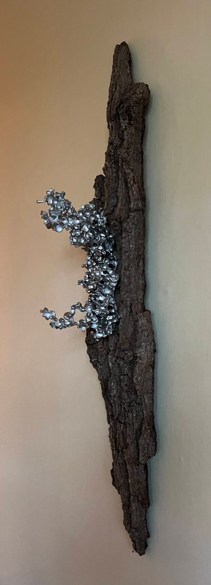 Radicaal gegoten aluminium gemonteerd op een mooi stuk eiken bast.
