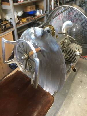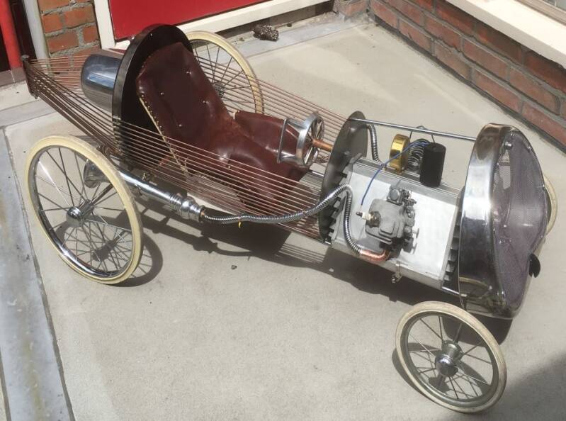 Hotrod samengesteld racemonster, aangepast kinderwagen onderstel en wielen, bouwlamp, cylinders van een motorzaag, diverse aluminium kaarsenstandaards, appelsnijder, deksel van een afvalemmer, leren tas, schroef van een buitenboordmotor e.v.a.